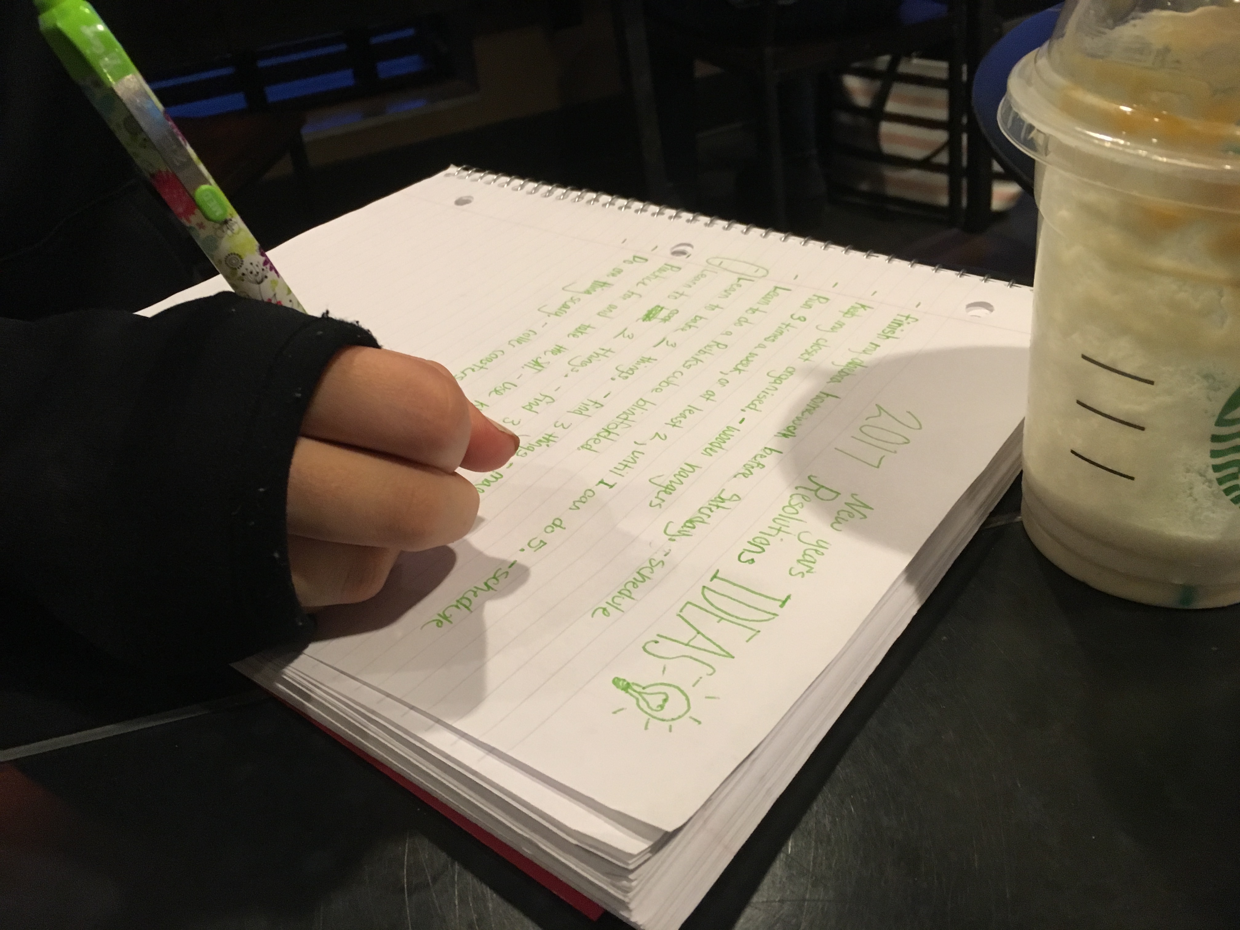 Each year, I take each of our kids out (one at a time) to Starbucks. This is a special time they really look forward to. They get to order one of their favorite drinks and we bring our notebooks to glance back at their goals from the past year and hash out some goals for the year ahead.