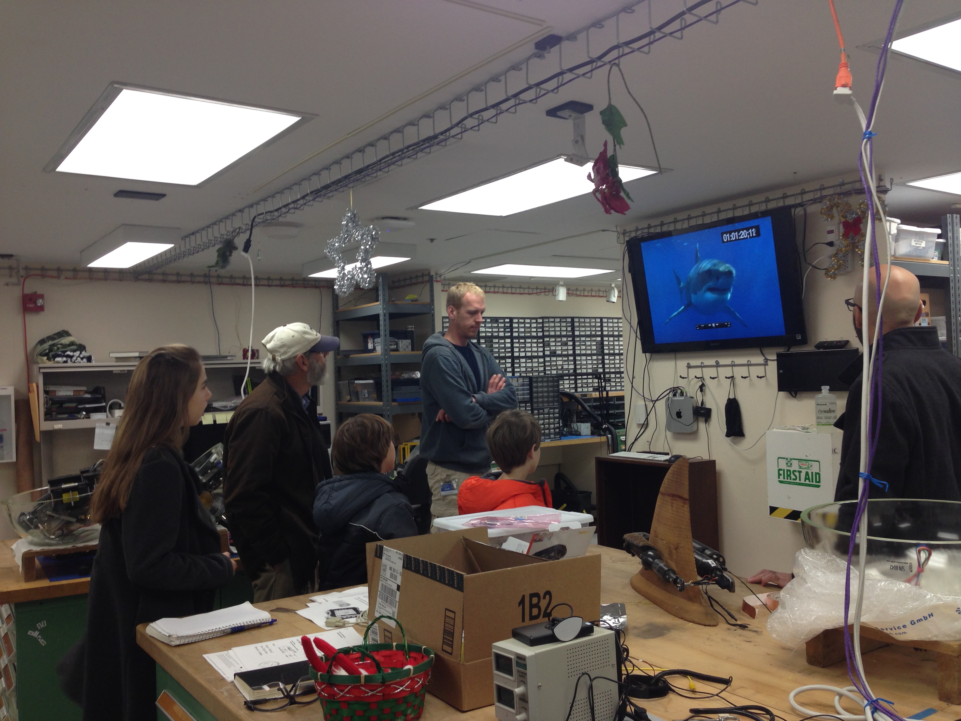 One of the most fascinating gadgets in the lab was the CritterCam that they use to capture point-of-view video from sharks. The camera is attached to a clamp that grips snugly to a shark’s fin and gets tighter as the shark pulls through the water. The CritterCam allows researchers to learn a great deal about a sharks behavior that was not possible before. Of course, getting the camera onto the shark is not trivial and can be very dangerous. See the video below where Mike has a very close encounter with a great white shark.