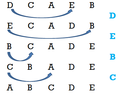 Then we continue the new cycle. The next swaps with the buffer are ‘C’ and then ‘B’. So the entire set of swaps can be written as: (D E) (B C B)