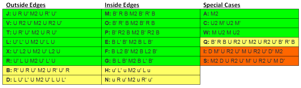As with the corners, many of the M2 setup moves become intuitive once you become familiar with them. In the table below I divided the targets into 3 categories. The outside edges pieces can be inserted starting with a U or U’ move, while the inside edges can be inserted starting with a B or B’ move. The targets highlighted in green are very similar and straightforward, and the targets highlighted in yellow are a little different since these edge pieces happen to fall into the top slice or back slice of the cube. The special cases are ones that should be memorized. Three of these are very easy, the Q target is slightly tricky, and the I and S moves will definitely take some practice to get familiar with. The good thing about the I and S targets is that they are the exact opposite of each other.