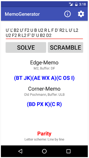 A very helpful tool to practice identifying and memorizing the letters is the mobile app MemoGenerator. This app generates a scramble without showing you the solution. Once you think you have the letter sequence figured out, you can select ‘Solve’ and it will display the correct letter sequence for the corners and the edges. It is very helpful early on to identify where you have made simple mistakes in the letter sequence. One thing to keep in mind is that when cycle breaks are needed, there are multiple options for breaking into the next cycle, so your solution can still be correct and not match exactly with the solution from MemoGenerator.