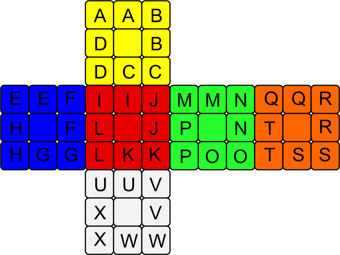 The edges are very similar. Take some time to get familiar with this scheme. It is not important at first for this to be automatic, but as it becomes more natural, it will make it easier and faster to memorize and solve the cube blindfolded. A good way to start is to learn the first letter for each face of the cube like a bookmark – A, E, I, M, Q, U. This way when you are looking for the T sticker, you can jump to Q and go around clockwise to find T.