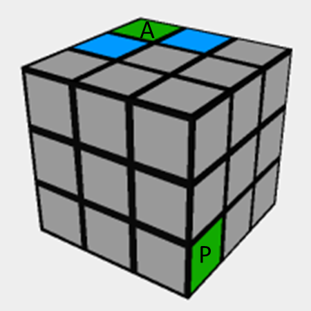 In this guide we will use the Old Pochmann method for solving the corners. There is a sequence of moves we will use to swap the stickers in the A and P positions in the picture below. A side effect of this swap is that the blue edge stickers also switch positions.